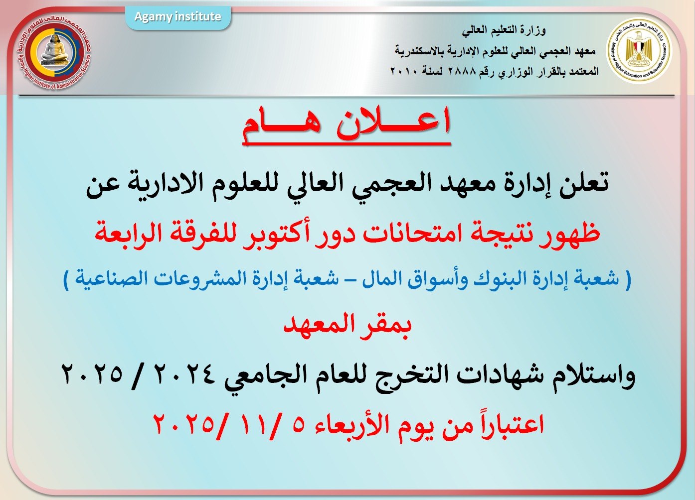 تعلن إدارة معهد العجمي العالي للعلوم الإدارية